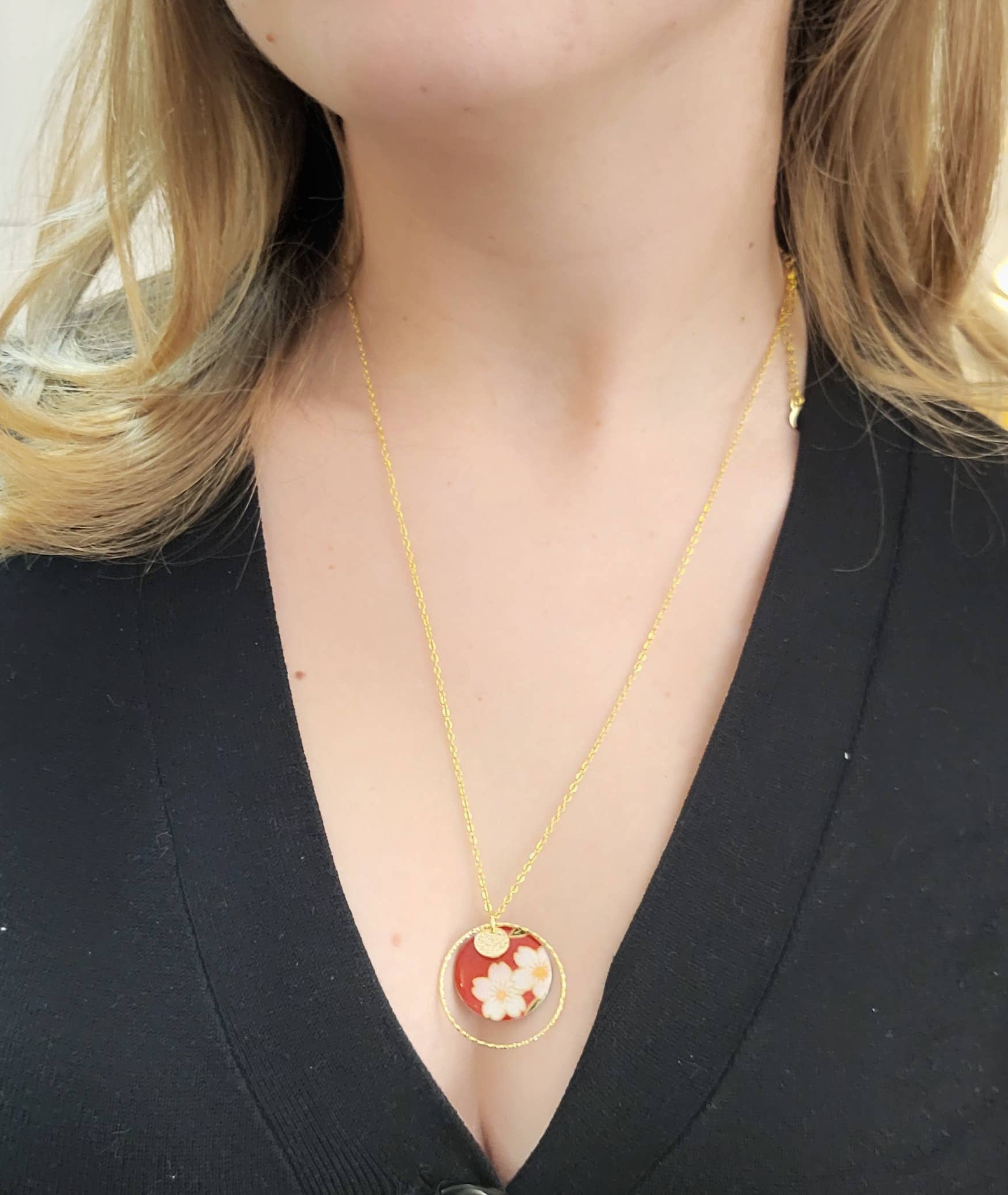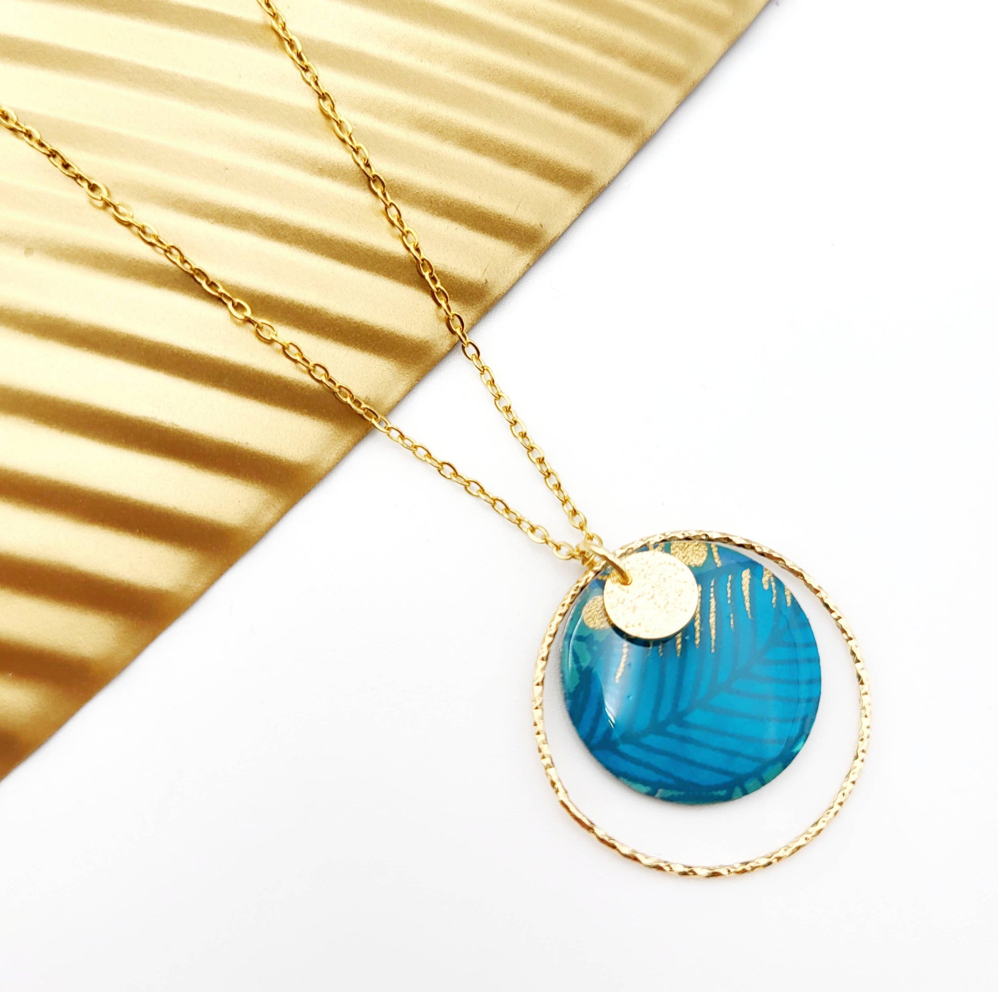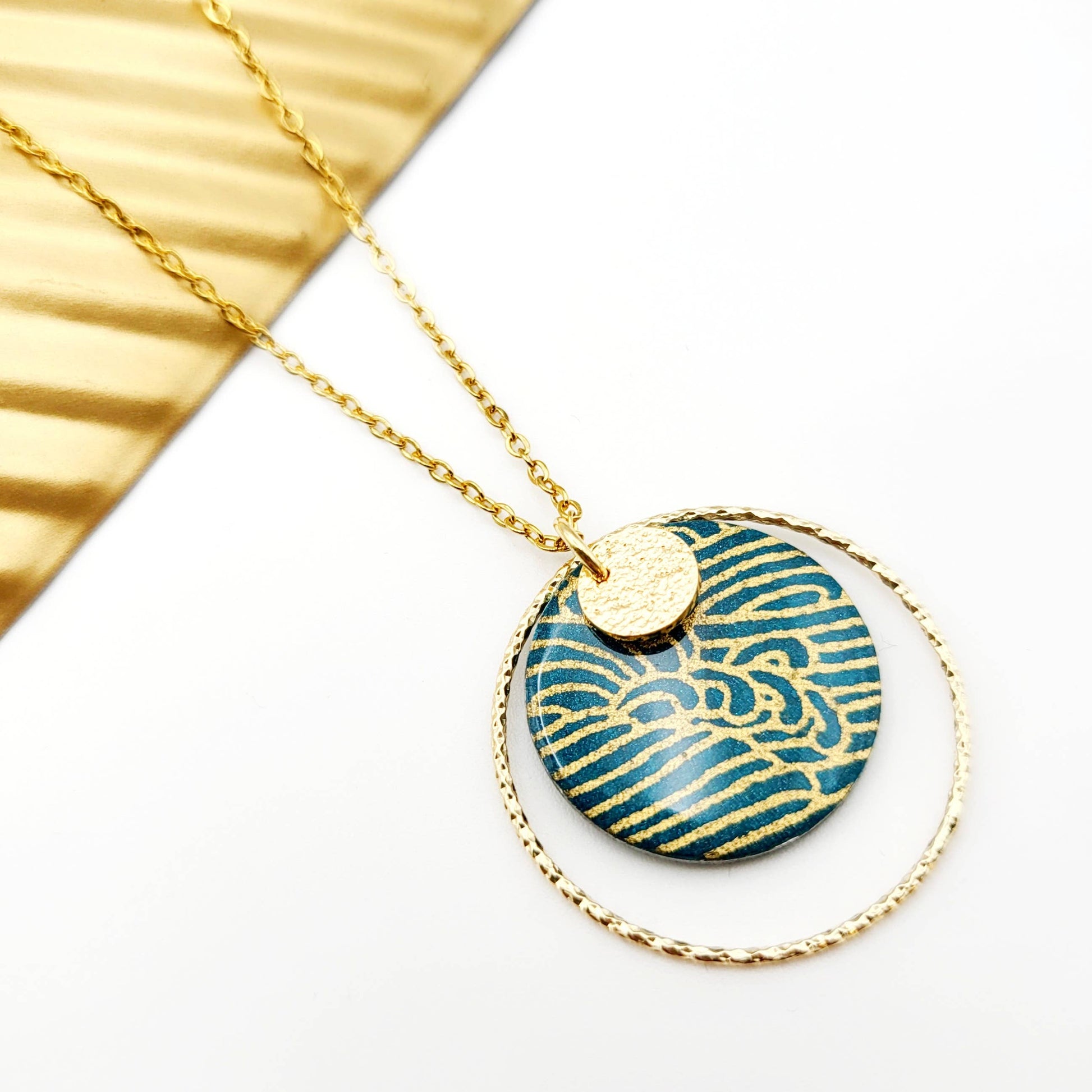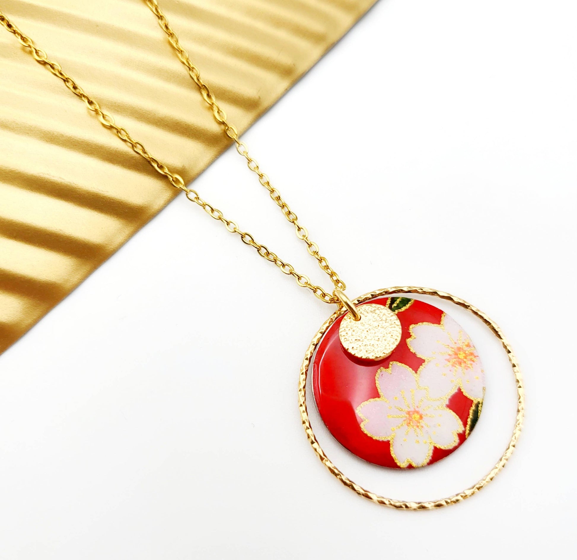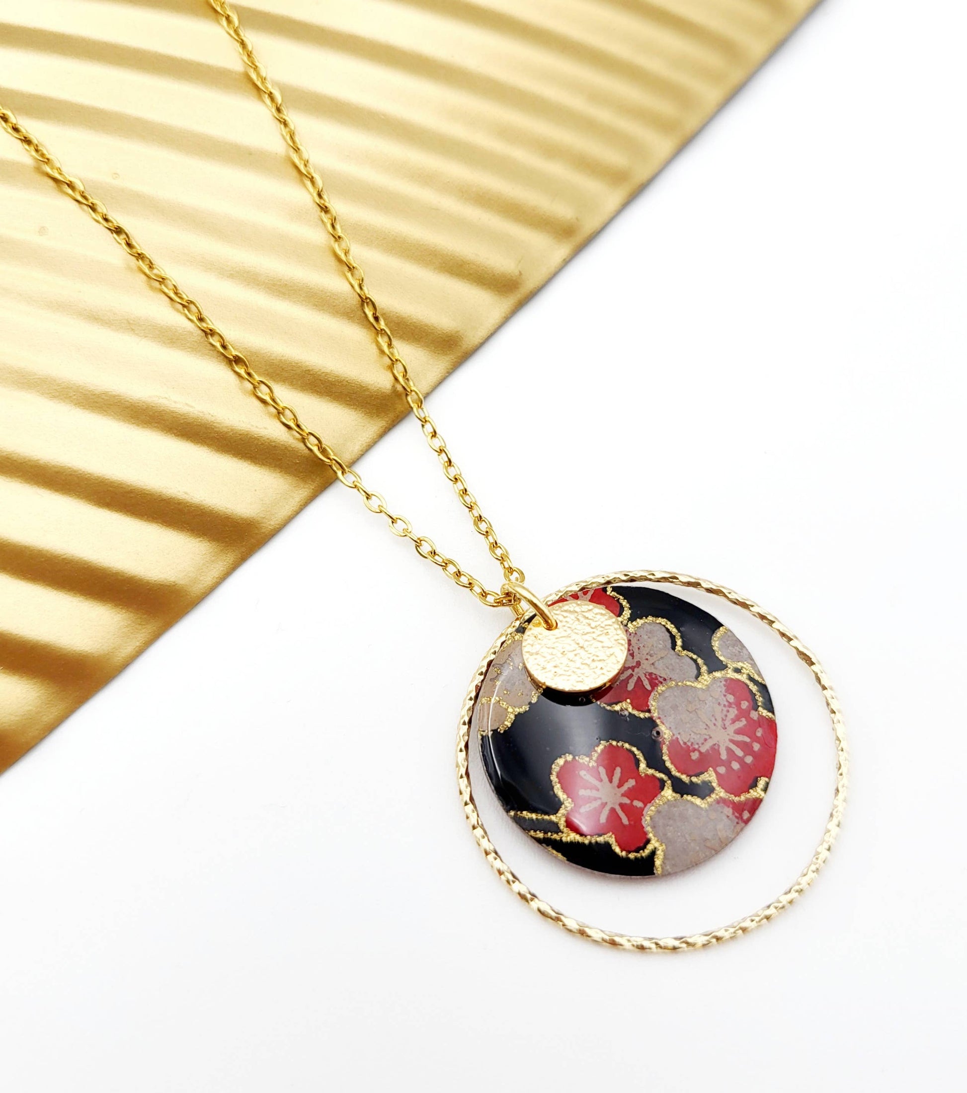 Le pendentif, de forme ronde et de taille moyenne, est minutieusement façonné à la main et orné de papier washi japonais, un matériau traditionnel prisé pour sa délicatesse. Il est ensuite recouvert d'une résine brillante pour une finition lisse et éclatante. Un anneau doré ciselé entoure le pendentif, et le revers est magnifiquement décoré d'émaux assortis à la teinte du papier. L'association de l'acier inoxydable doré et du papier japonais confère à ce collier TAE un charme intemporel, parfait pour résister à un usage quotidien.
