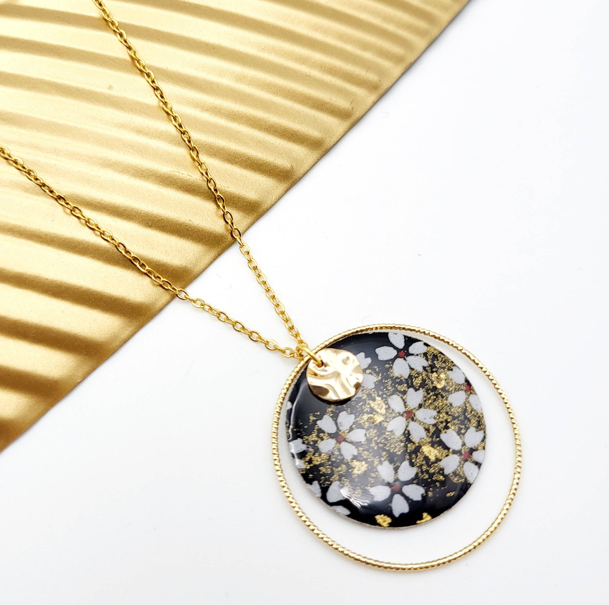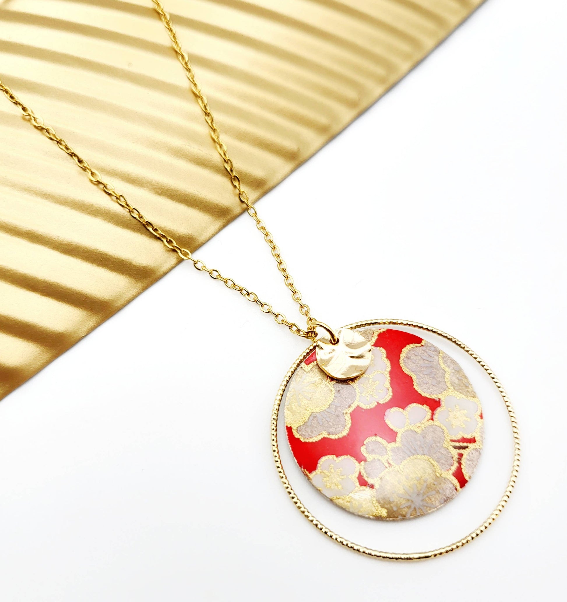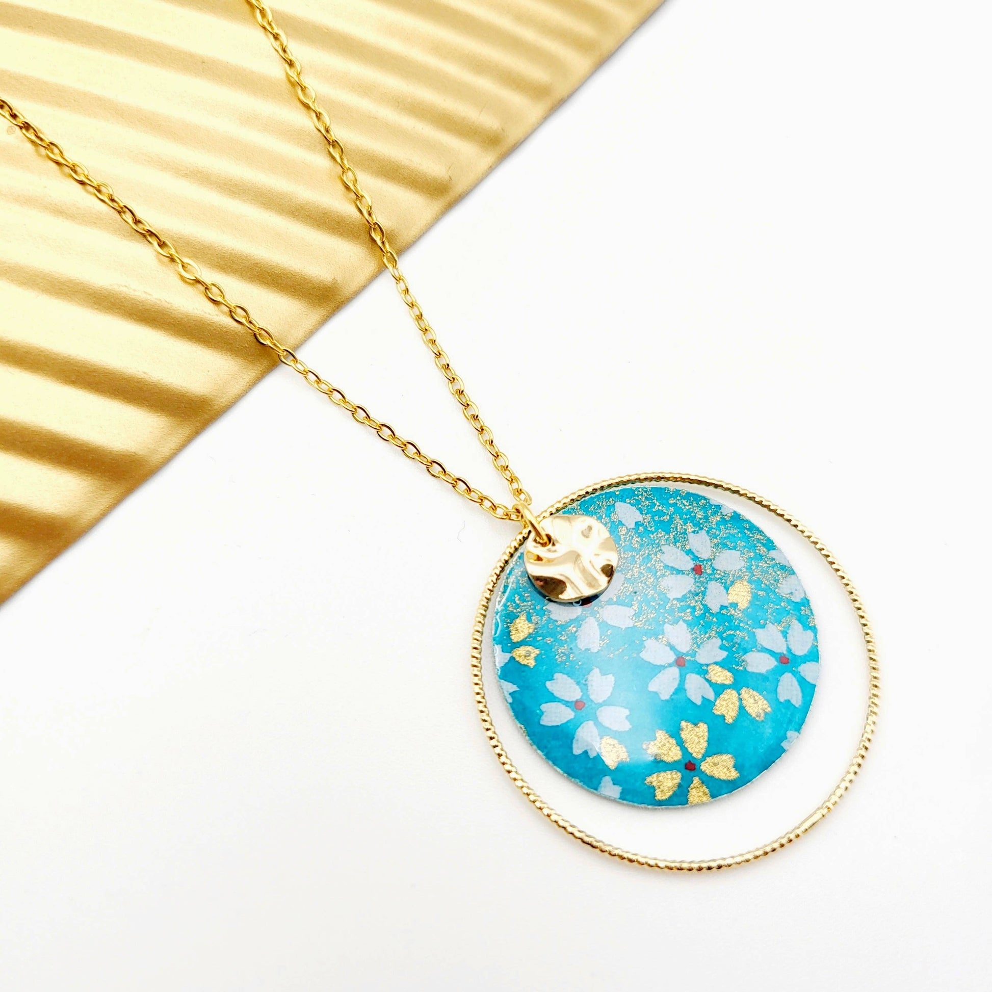 Le pendentif, de forme ronde et taille moyenne, est méticuleusement façonné à la main avec du papier washi japonais, un matériau traditionnel reconnu pour sa légèreté et sa beauté. Il est ensuite recouvert d'une résine brillante qui lui confère une finition lisse et éclatante. Un anneau doré ciselé enveloppe le pendentif, tandis que le revers est sublimé par des émaux aux teintes parfaitement assorties au papier.