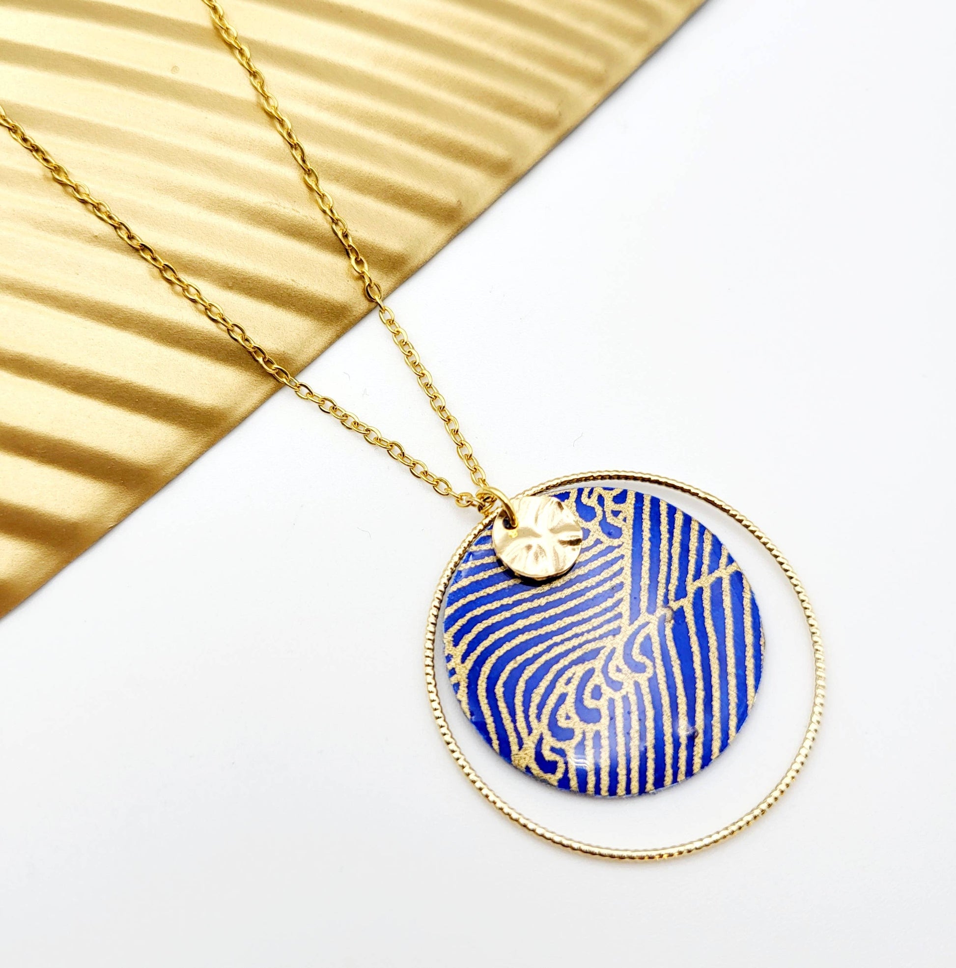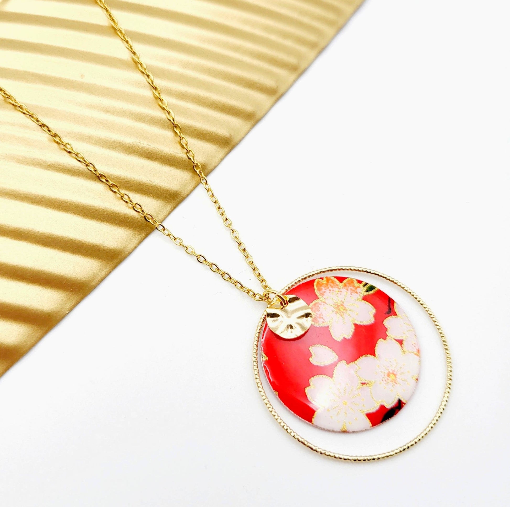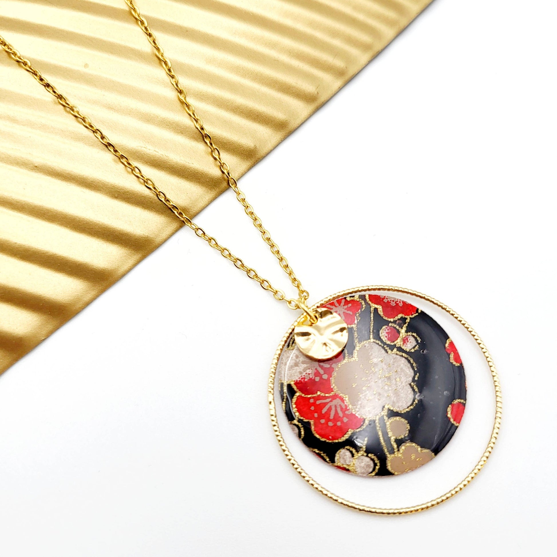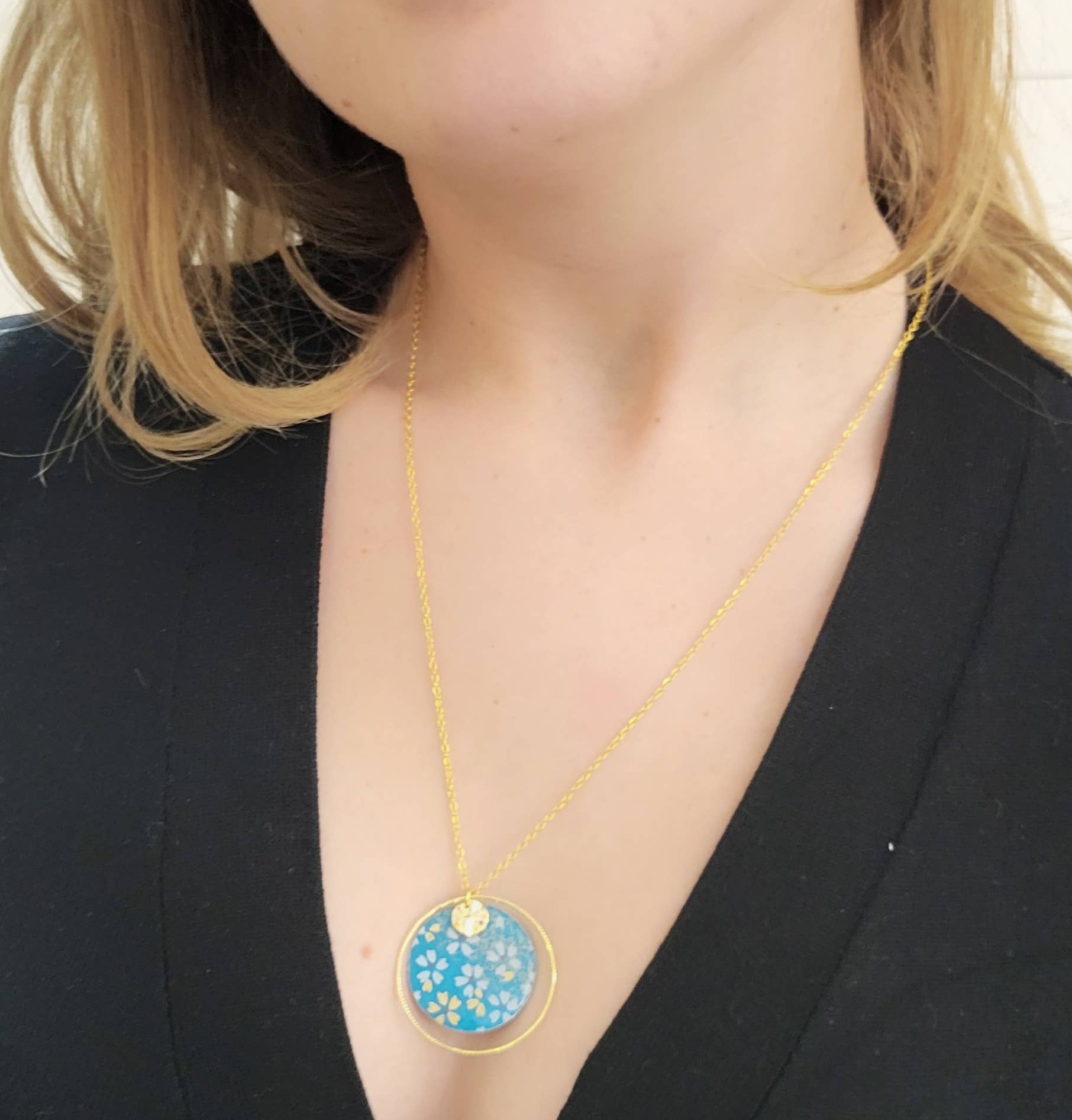 Le pendentif, de forme ronde et taille moyenne, est méticuleusement façonné à la main avec du papier washi japonais, un matériau traditionnel reconnu pour sa légèreté et sa beauté. Il est ensuite recouvert d'une résine brillante qui lui confère une finition lisse et éclatante. Un anneau doré ciselé enveloppe le pendentif, tandis que le revers est sublimé par des émaux aux teintes parfaitement assorties au papier.