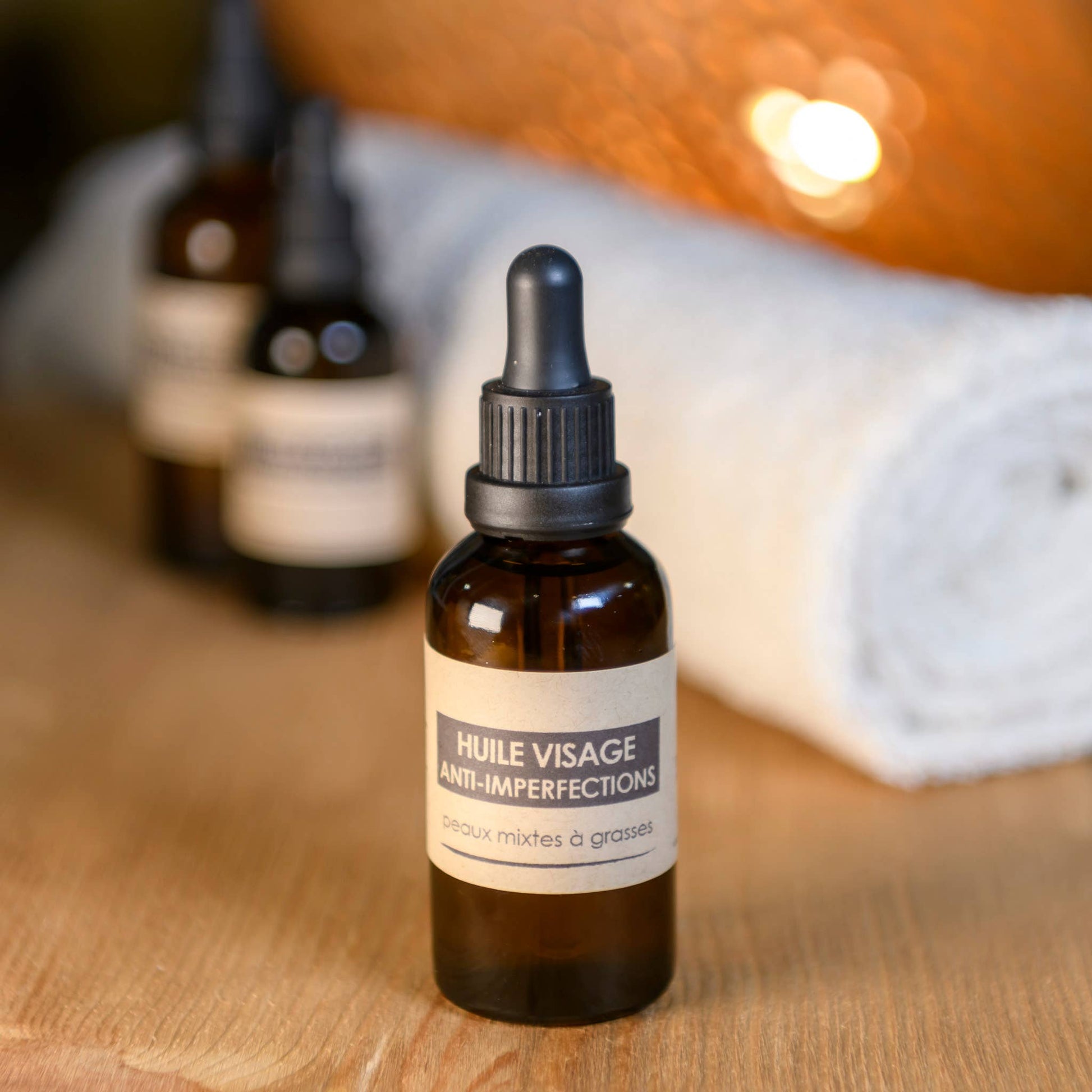 Huile anti-imperfections pour le visage, composée d'huile de nigelle et d'une synergie d'huiles essentielles qui visent à purifier, tonifier et régéner les peaux abîmées ou les peaux à problèmes. Produit réalisé à partir d'huiles et ingrédients biologiques dans notre laboratoire à Ganges, dans le sud des Cévennes.